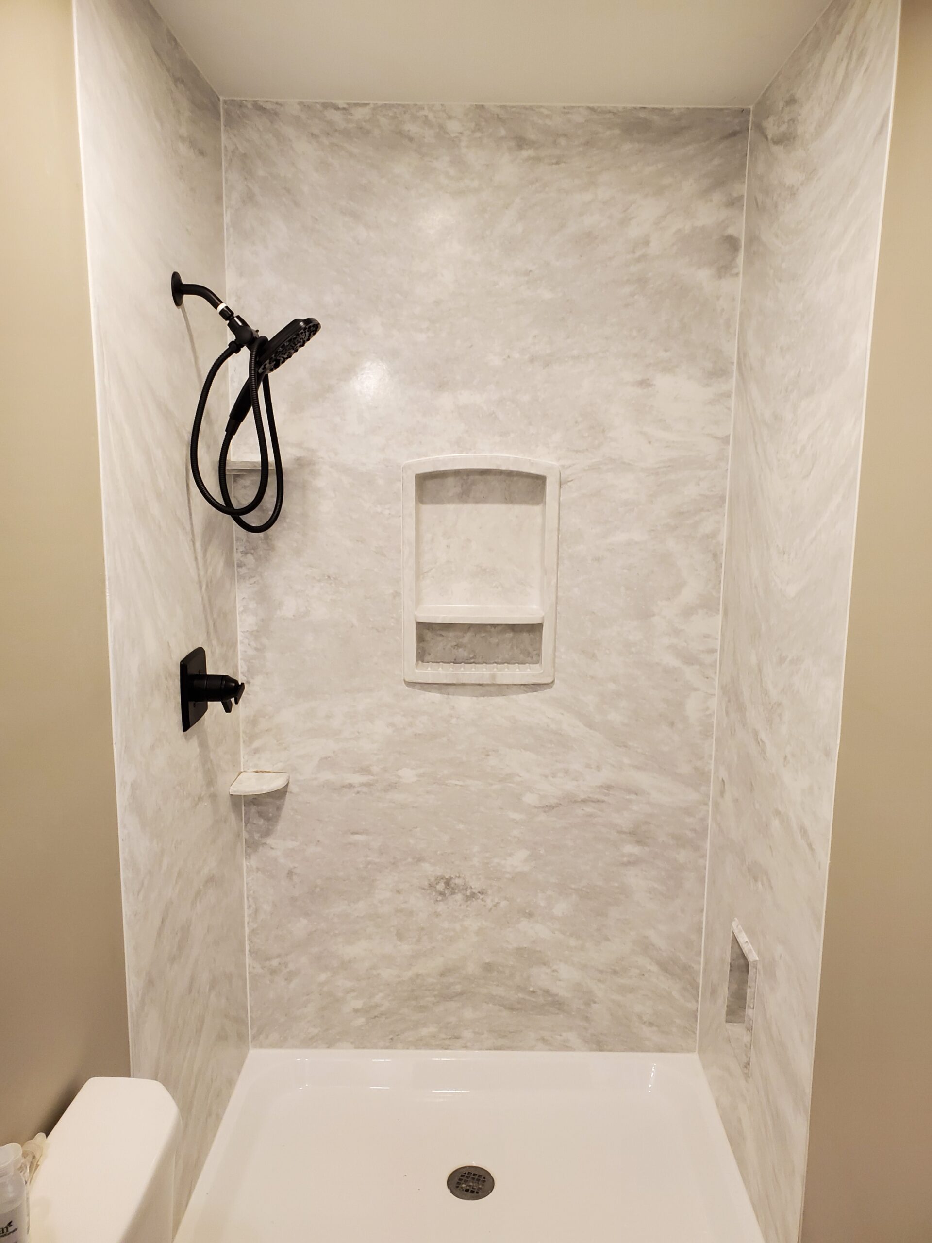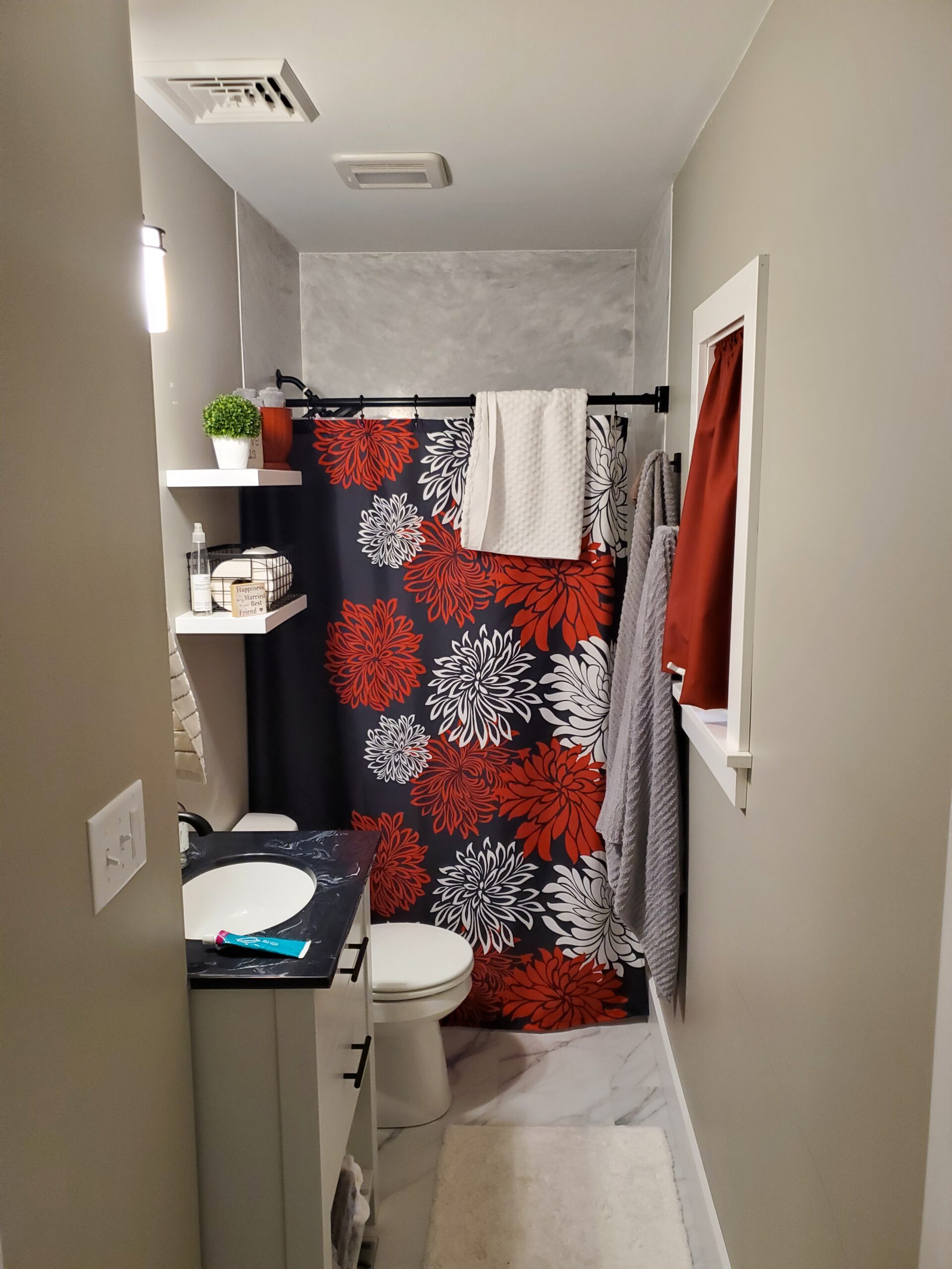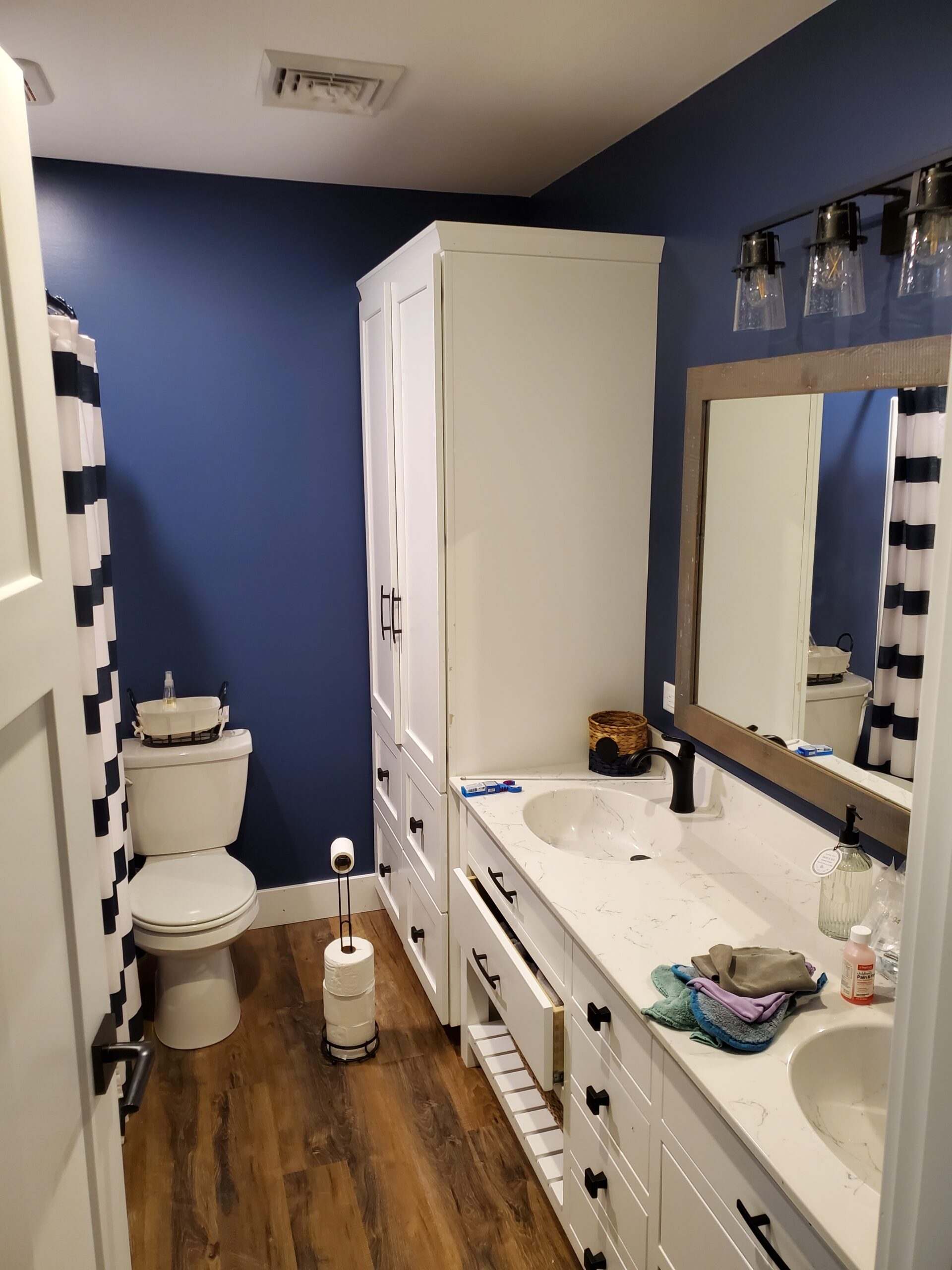 Going after a Modern Farmhouse look, we put in a custom wood mirror frame, black hardware, & dark blue wall paint. Also unique features of this space was turning one larger bathroom into 2 so that there could be a master bath next to the master bedroom. We also wanted to utilize a laundry room below and a previously supplied hole in the floor to pass laundry through. To do that, we had to downsize a traditional 60” tub/shower combo to a 54” and do some custom finagling of walls and holes to be able to use the laundry “shoot”. At the end, we could walk away with 2 full baths, but with tighter spaces. At least, the master shower is 4’ wide and I got to try a different, non-tile, seamless material for the master bath. Nothing worse than a tight shower for a large man like me!