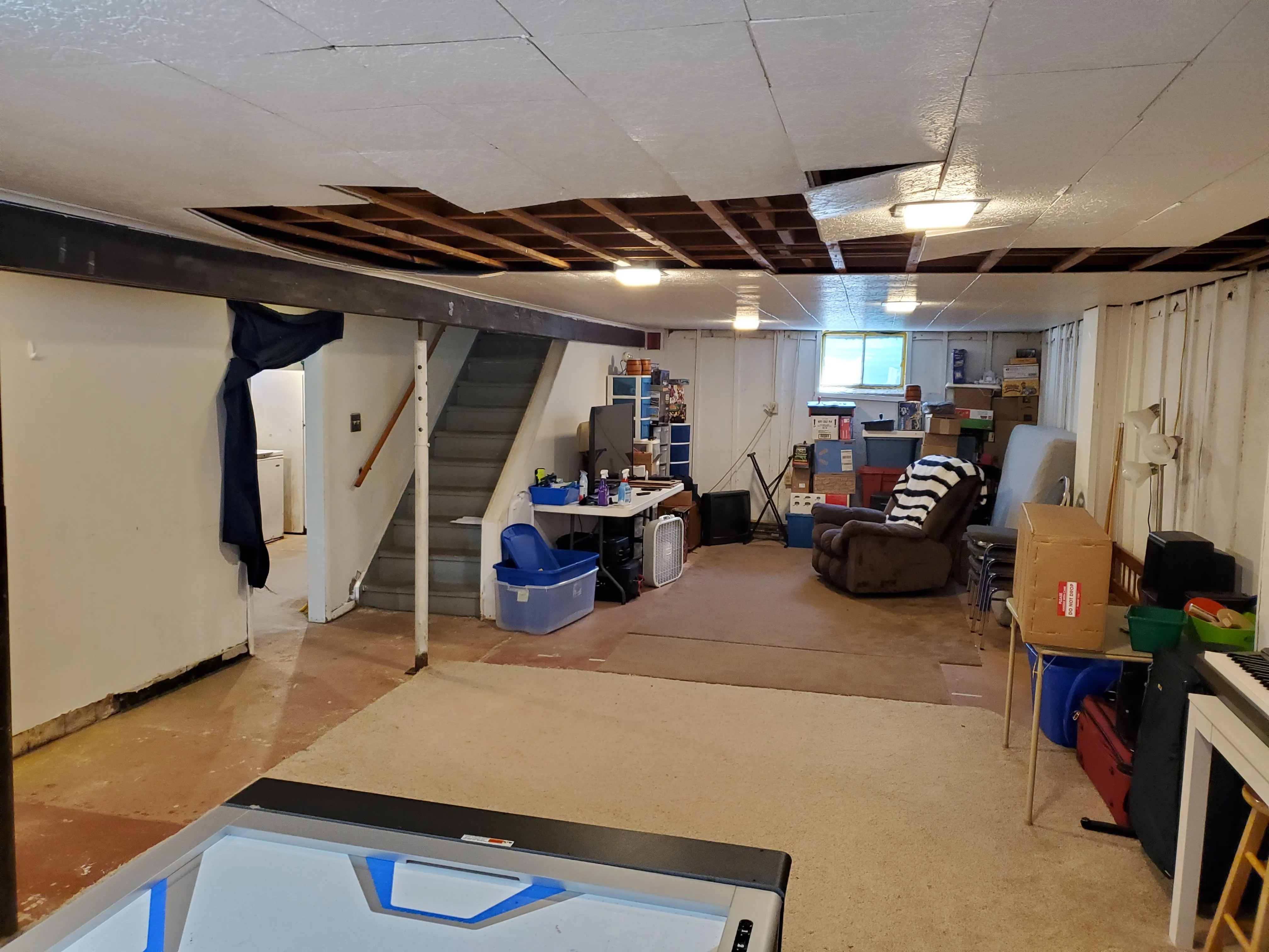 This was another fairly typical basement finish coming on the heels of another contractor dropping the ball on them. One of the challenges in this space was configuring a bathroom in proximity to existing plumbing drains and MEP piping. We ended up completely closing a floor drain and pouring self-leveler to bring it up to plane and then custom built some walls and installed an up-flush system that tied into a nearby sewer pipe. Other procedures were pretty common and entry level such as fiberglass insulated walls, drop in shower unit, LED lighting, drop ceiling, and LVT flooring.